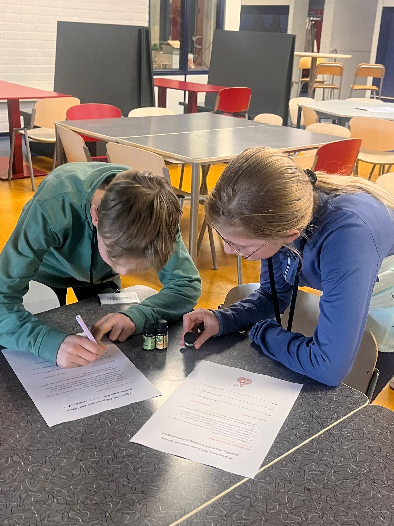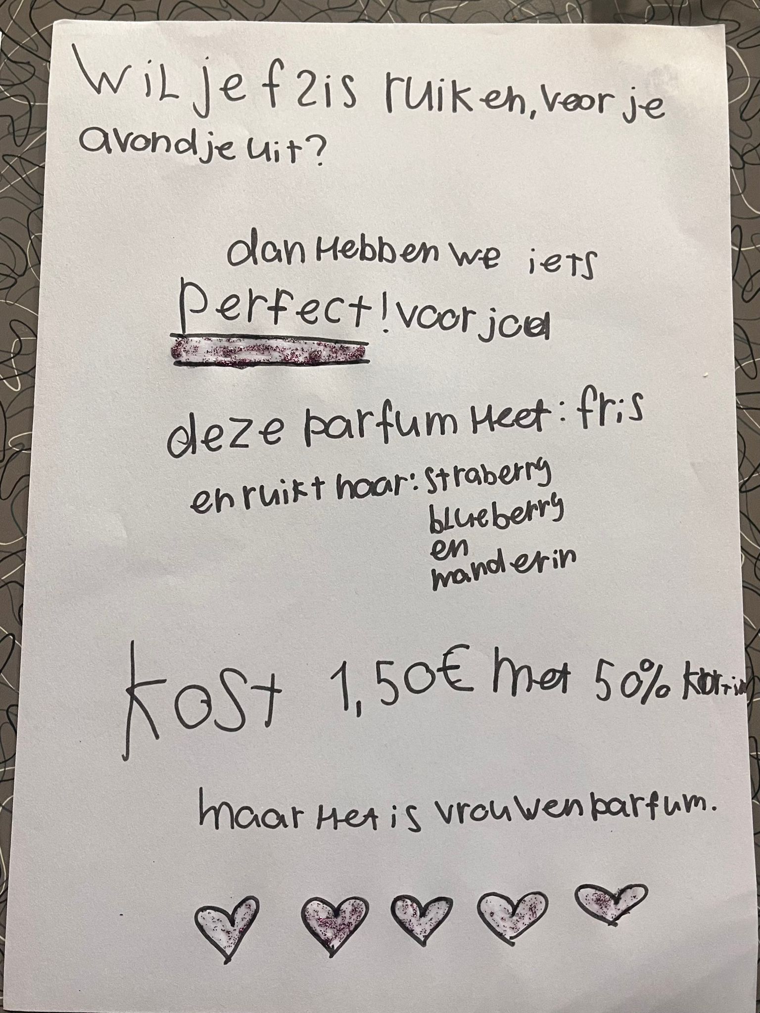 In tweetallen werd er een eigen parfum bedacht, een poster/flyer ontworpen én natuurlijk een overtuigend verkooppraatje gehouden.
