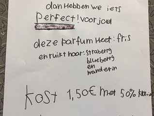 In tweetallen werd er een eigen parfum bedacht, een poster/flyer ontworpen én natuurlijk een overtuigend verkooppraatje gehouden.